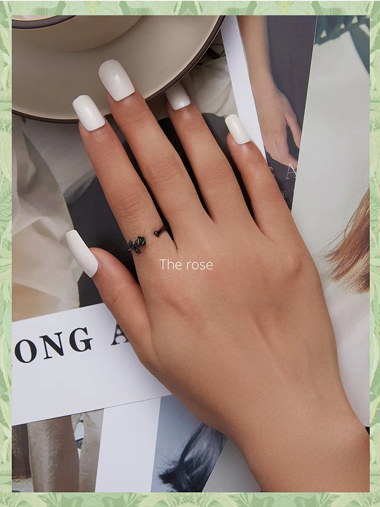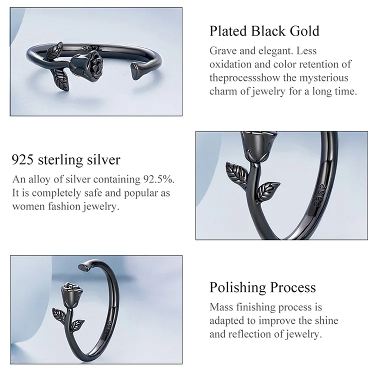 925 Sterling Silver 3D Thorns and Rose Adjustable Finger Rings for Women Plated Black Gold Flower Ring 2 Colors BSR065