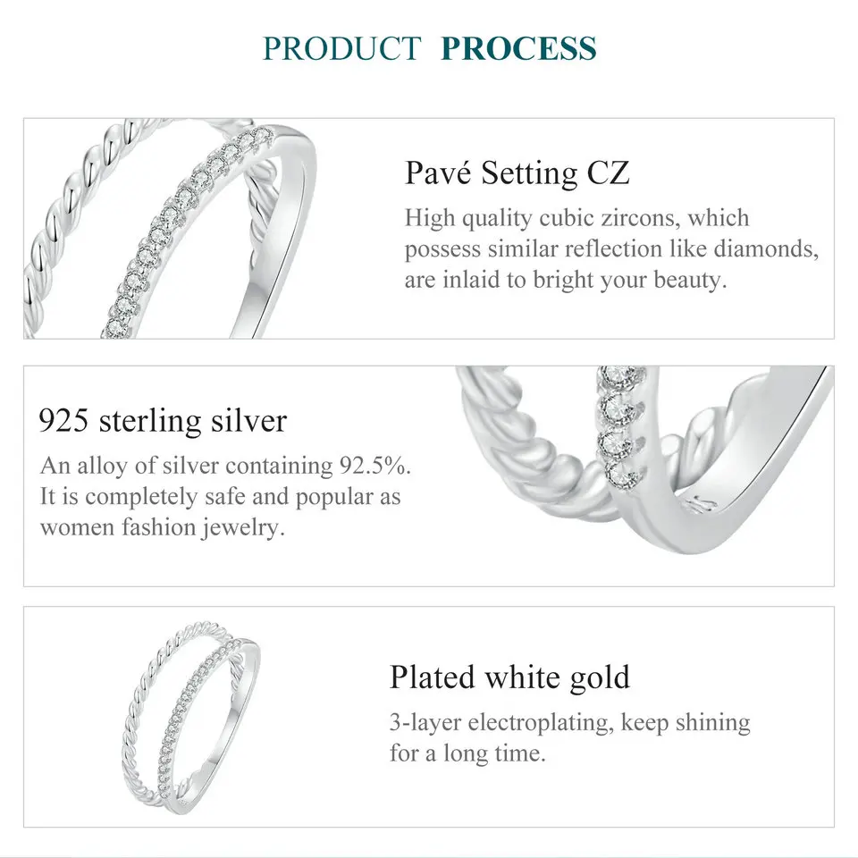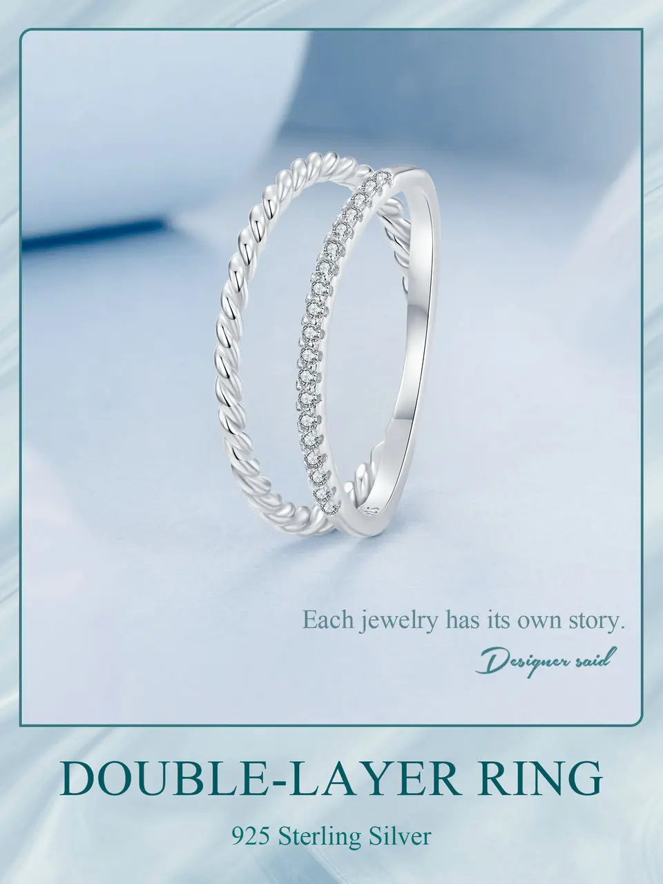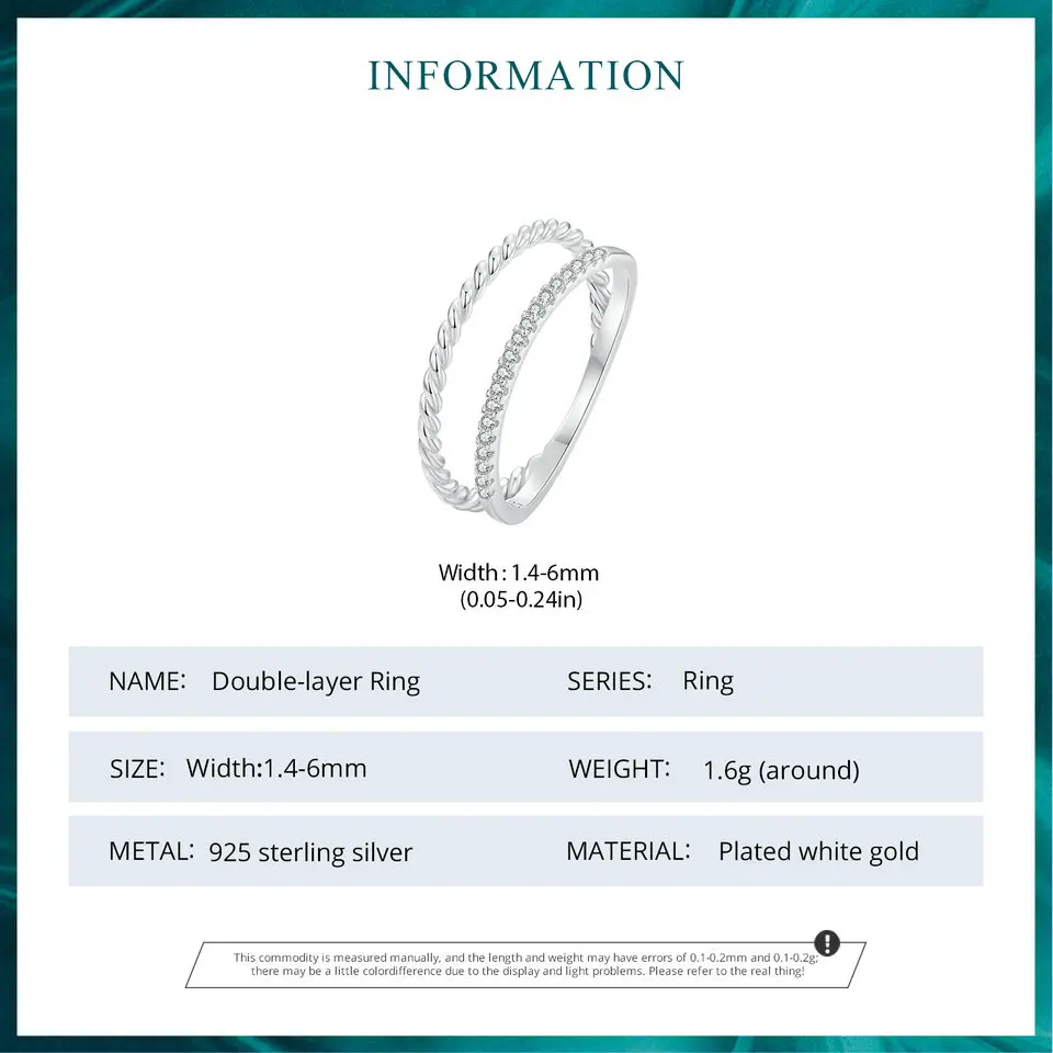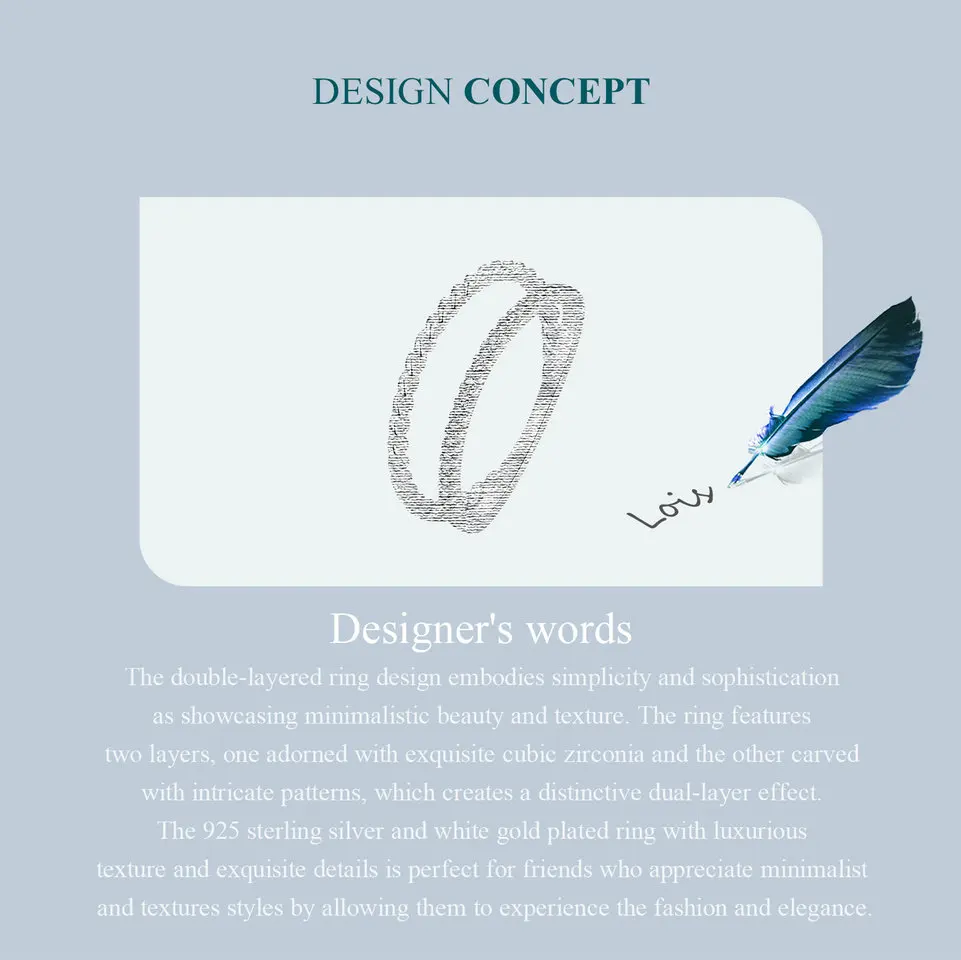 ❤ [Description] The double-layered ring design embodies simplicity and sophistication as showcasing minimalistic beauty and texture. The ring features two layers, one adorned with exquisite cubic zirconia and the other carved with intricate patterns, which creates a distinctive dual-layer effect. The 925 sterling silver and white gold plated ring with luxurious texture and exquisite details is perfect for friends who appreciate minimalist and textures styles by allowing them to experience the fashion and elegance.